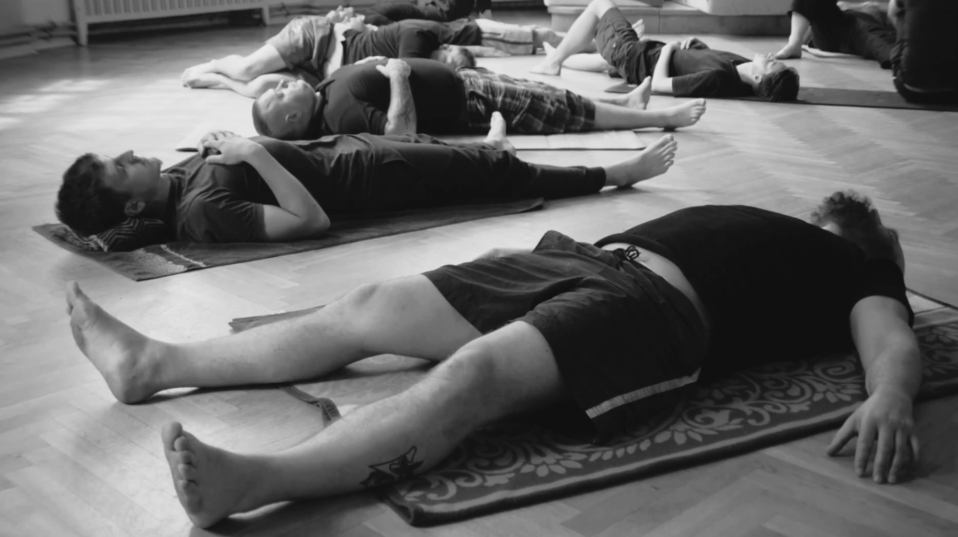 Praca z ciałem w formule małej męskiej grupy 8 osób. Robimy wspólny rozruch a potem praca indywidualna z terapeutą na tle grupy.